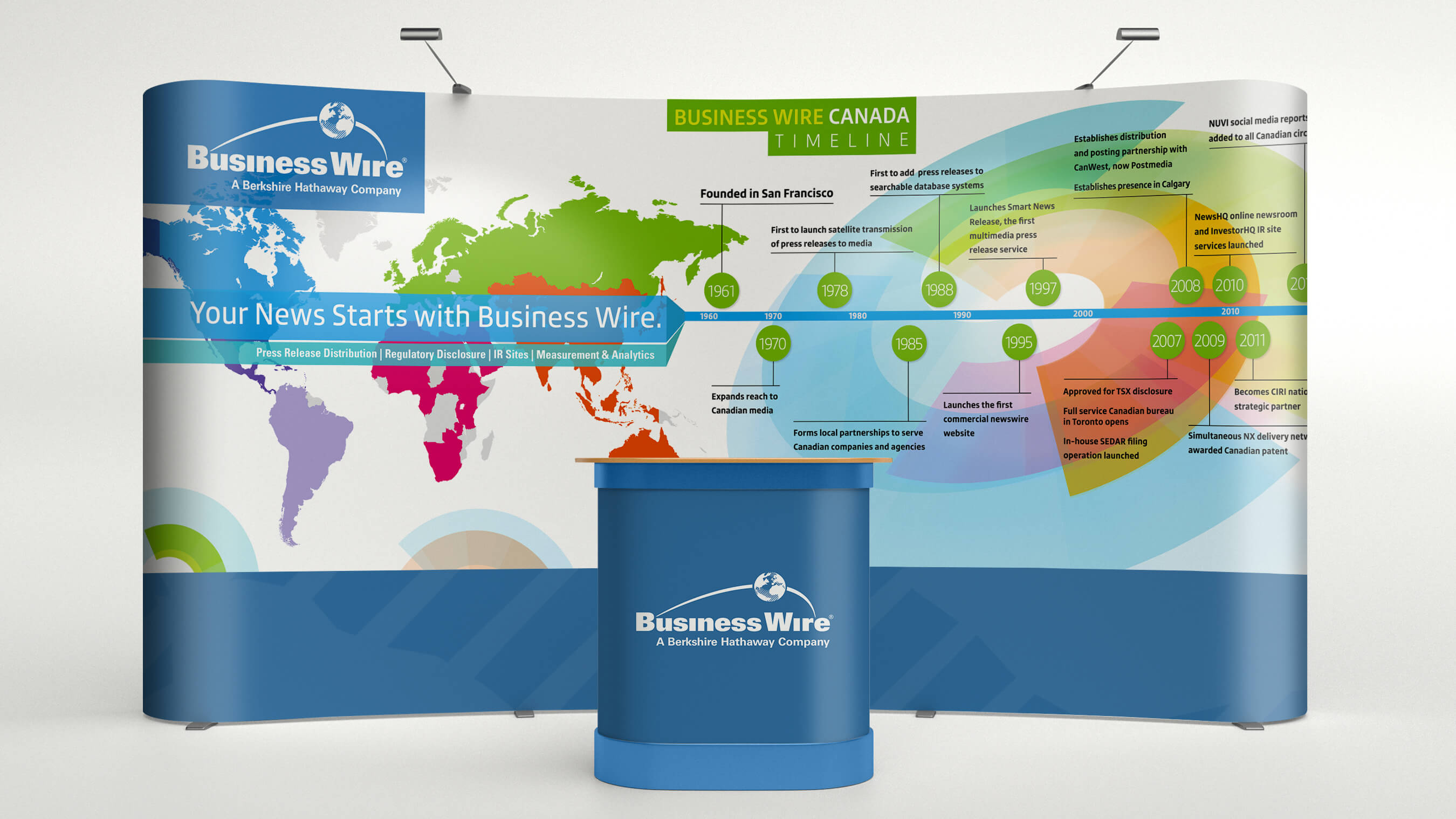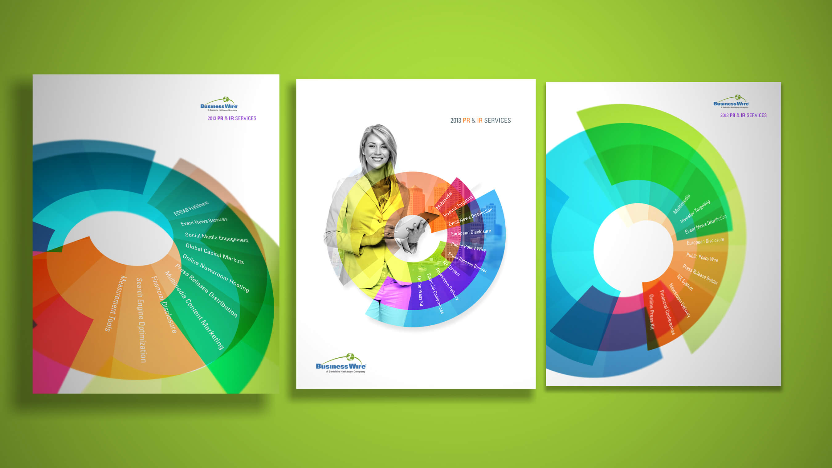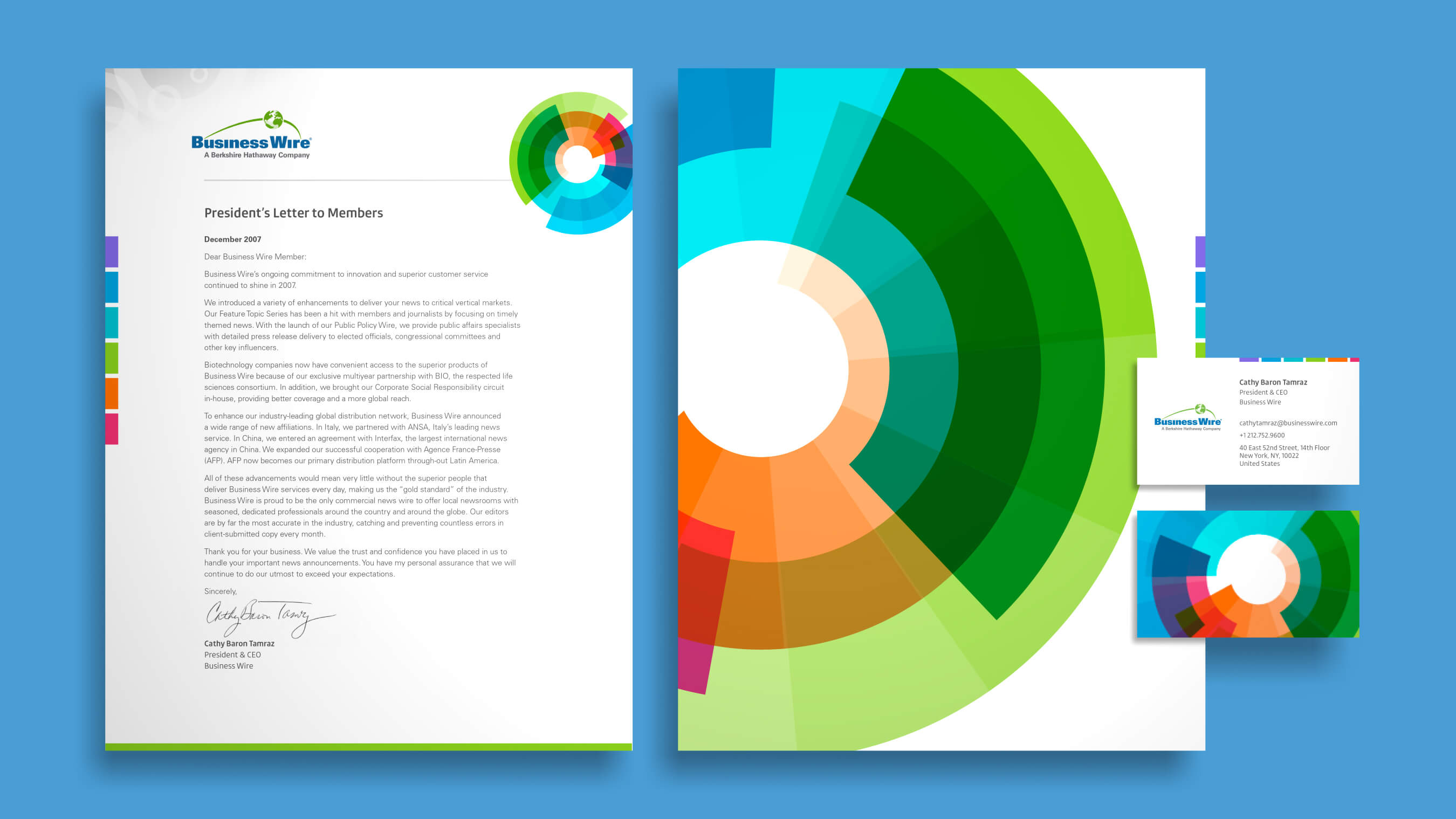 Business Wire wanted a fresh look for their company - something that showed its multidemnonsionality in a clear and purposful message. The dial graphic was developed along with its diverse range of colors. This image was implemented company wide and viewed all around the world.