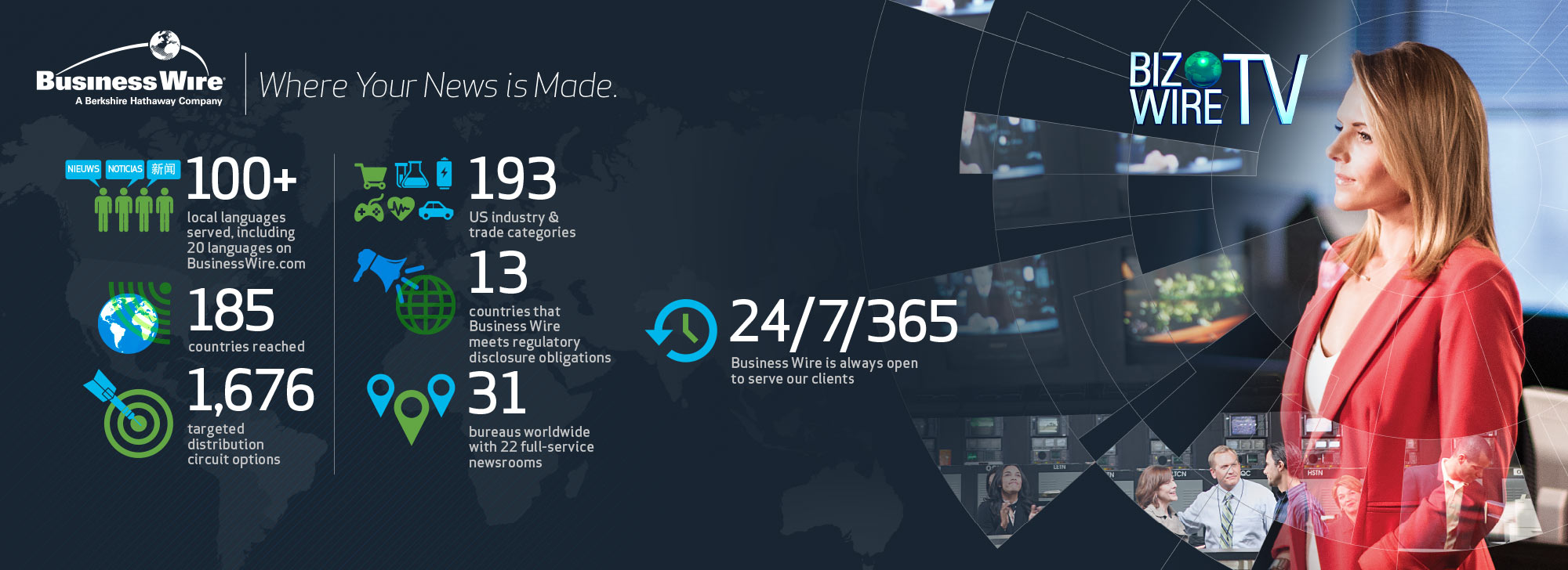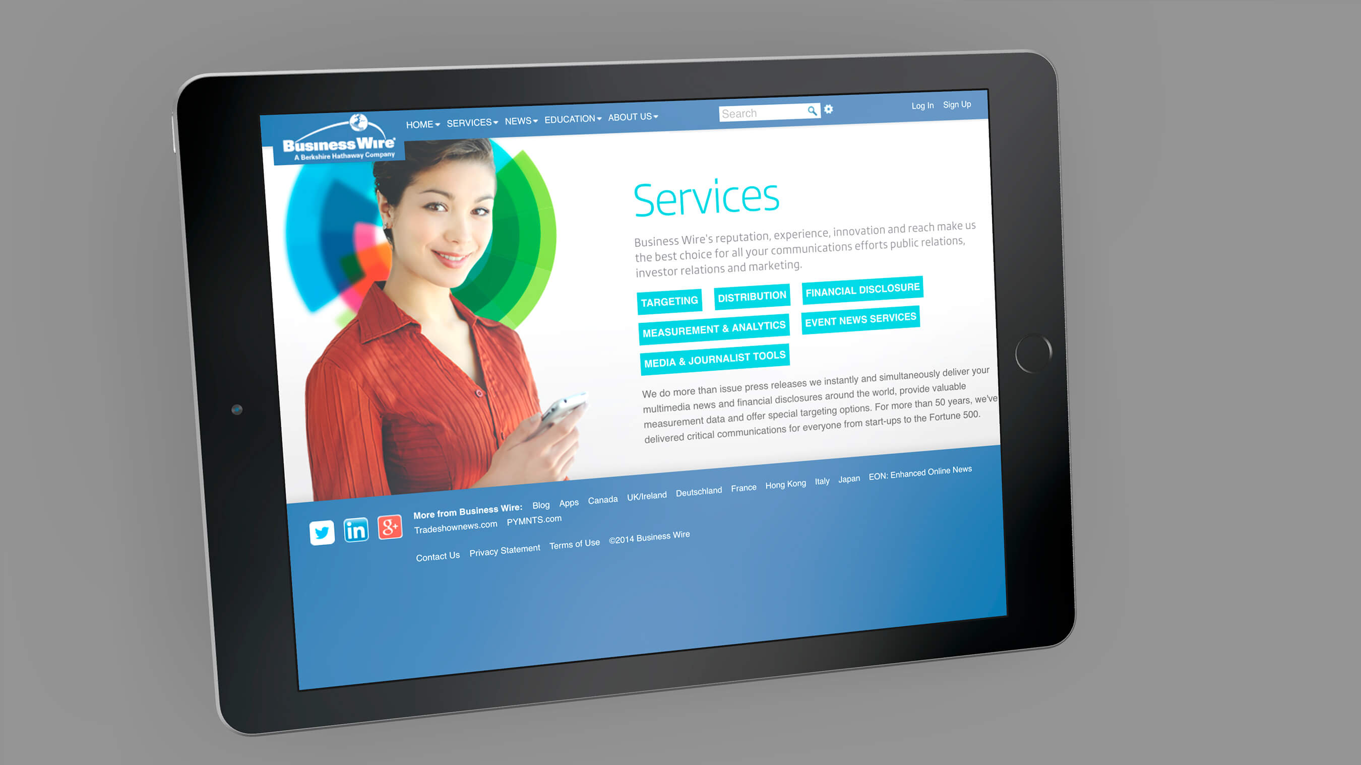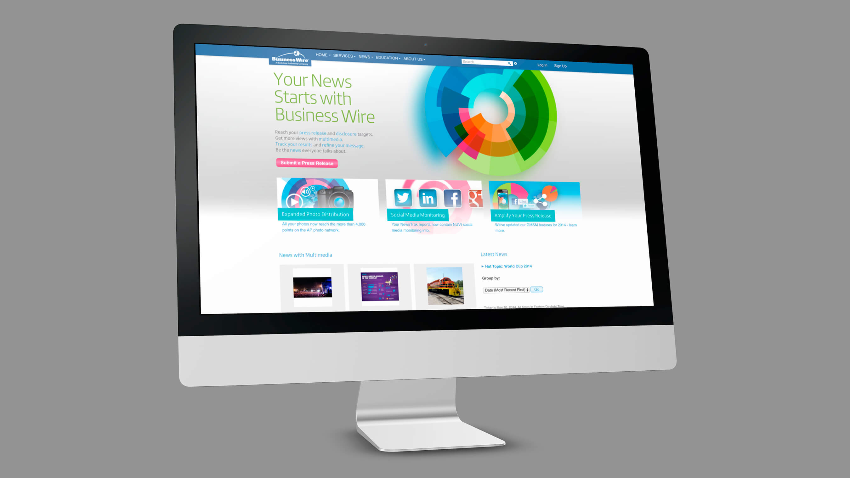 Business Wire wanted a fresh look for their company - something that showed its multidemnonsionality in a clear and purposful message. The dial graphic was developed along with its diverse range of colors. This image was implemented company wide and viewed all around the world.