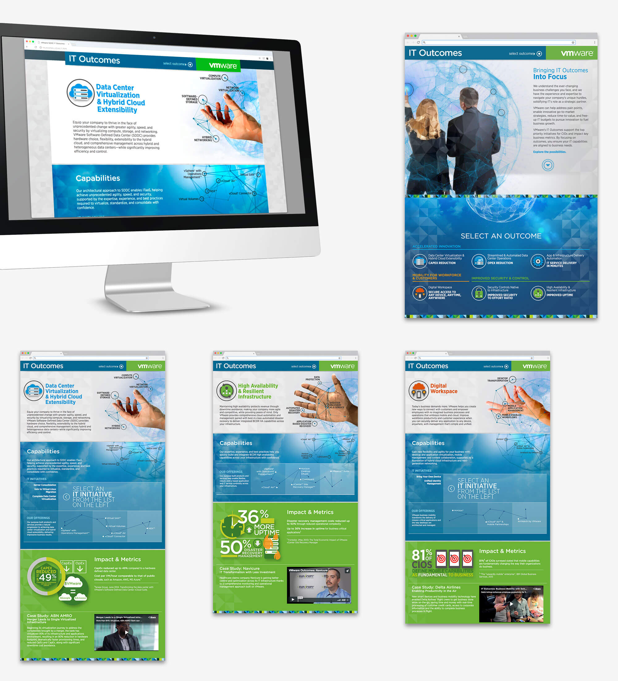IT Outcomes is a set of tools used by VMware's sales force to show how a client can reach the desired outcome using the VMware suite of products. Some project components were used to educate the sales team at VMware. The design concept shows the plexus of interconnected VMware apps.